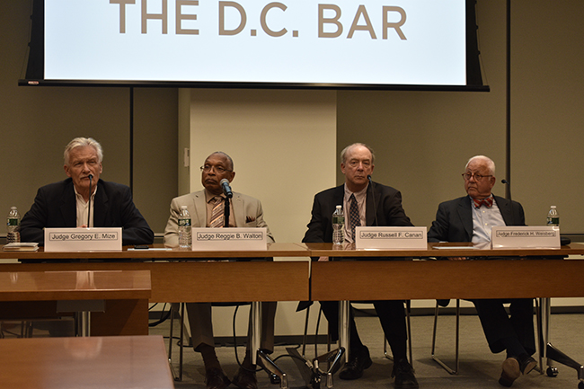 The D.C. Bar Communities Office hosted Judges Gregory E. Mize, Reggie B. Walton, Russell F. Canan, and Frederick H. Weisberg on October 10 to discuss the book Tough Cases, which they co-wrote with nine other judges from around the country.