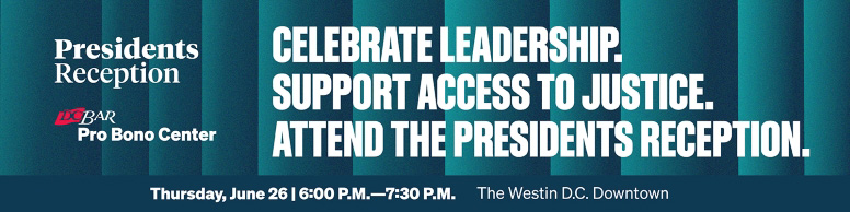 The Presidents Reception is the D.C. Bar Pro Bono Center’s premier annual event that celebrates the incoming President of the D.C. Bar. Funds raised advance critical legal services for District residents who face legal challenges without the means to afford an attorney. Join leaders from across the legal community for an open-bar cocktail reception, networking opportunities, and brief celebratory remarks.